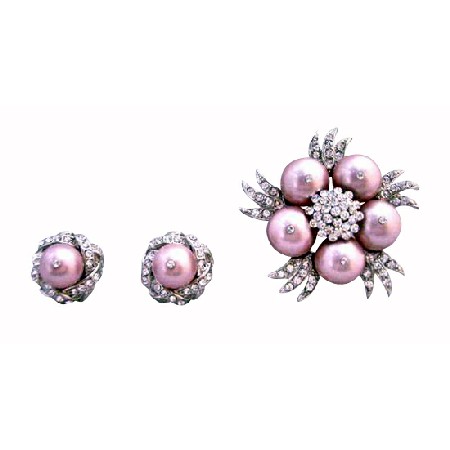 Gorgeous Rose Swarovski Pearls Brooch w/ Matching Earrings Swarovski Rose Pearls w/ Diamante Surrounded