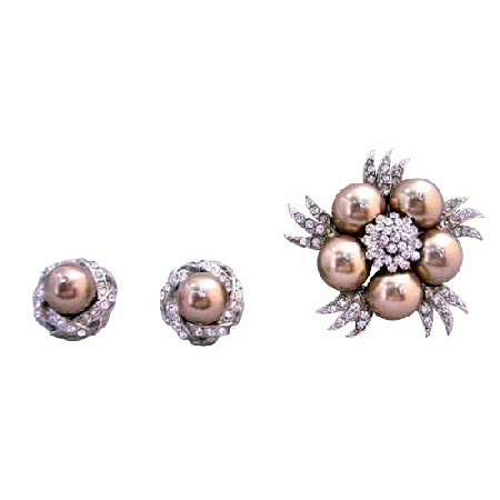 Champagne Pearls Brooch Earrings NEW COMBO Wedding Jewelry with Swarovski Pearls & Diamante