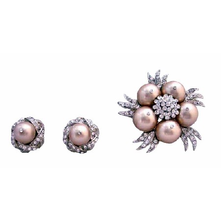 Bronze Swarovski Pearls Stud w/ Bronze Pearls Brooch Decorated with Diamante