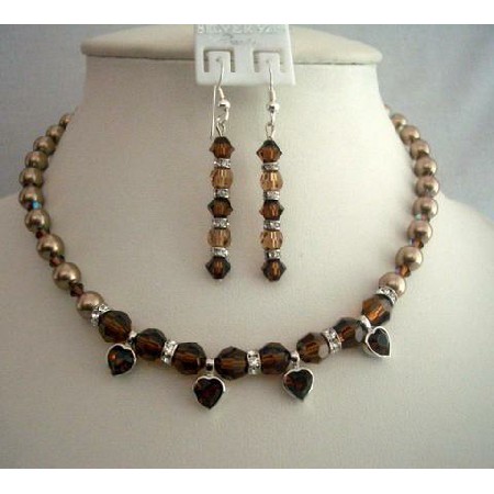 Made with 1st Quality Swarovski Pearls & Crystals! We have handcrafted each Necklace using our own original designs. All of our designs are based on beautiful & unique Vintage Style Jewelry from many different eras. We always use the finest quality of Crystals & components.Material Used Gleaming Large 7mm Swarovski Bronze Pearls 4mm Bicone Smoked Topaze Crystals 8mm Round Smoked Topaz & 6mm Rondelles with Crystals Heart Pendant enhance the beauty of Necklace & Rondells holding the heart. The Necklace Length 16 inches with 2 inches extension Sterling Silver French Wire Earrings with 6mm Bicone Smoked Topaze 6mm Round Lite Smoked Topaze Crystals beads. with 4mm Rondelles. measures 1 1/2 inches long. This gorgeous & lustrous piece you are looking is made from the highest quality material & crafted by professional Handmade