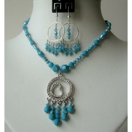 Handmade Exquisite Set! All A Grade & Material are used to make this beautiful set. This dramatically elegant Necklace adds a touch of the exotic to any look. Gleaming Large 6mm Bicone 6mm 8mm faceted Round Swarovski AB Turquoise Crystals accented beautiful in Necklace with Fully embedded Cubic Zircon Round Pendant holding Heart & Crystals. This gorgeous & lustrous piece you are looking is made from the highest quality material & crafted by professional Handmade.The Necklace measures 16 inches with lobster clasp for adjustment& extension 2 inches. Pendant measures 2 1/2 inches longMatching Sterling Silver 92.5 Chandelier Earrings with AB Turquoise Crystals Dangling measures 2 inches