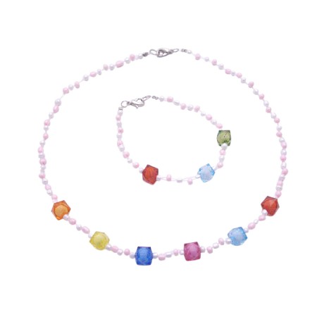 Beautiful Necklace & Bracelet made with Tiny Pink Beads & Multicolored Cube Beads accented in comfortable to wear Necklace & Bracelet soft & tender. soft stuff. This wonderfully whimsical Necklace with good quality Dress up your Daughter with fashion trendy jewelry or give her friends as Return Girfts This is such a sweet necklace & bracelet! Beautiful shades look so pretty together!.