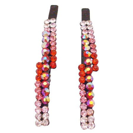 Two fancy bobby pins adorned accented with Red Pink crystals & clear crystals on enamel black metal hair bobby pin cute & fun embellishment that touch of sparkle & elegance to improve any hairstyle. Thes bobby pins are perfect for the prom girl or for a modern twist to your teen girls hairstyle.