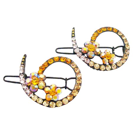 Hair clip in black metal with clear Jonquil Clear & Lite Topaz Crystals with cute flower. These sparkling all yellow gold shade Crystals are dazzling catching every color & light ray & adding just the right touch to your evening or formal occasion.