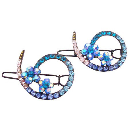 Hair clip in black metal with clear Aquamarine & Lite Sapphire Crystals with cute flower. These sparkling all Lite Sapphire Aquamarine shade Crystals are dazzling catching every color & light ray & adding just the right touch to your evening or formal occasion. The uses for this item is endless!.