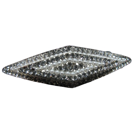 An elegant yet carefree design this gorgeous diamond shap hair barrette features white pearls clear rhinestones unique shape & surrounded with small iridescent clear rhinestones. This is fashion with originality excellent designs & quality barrettes pony tail holders shawls bridesmaid accessories. Designer quality at reasonable price.