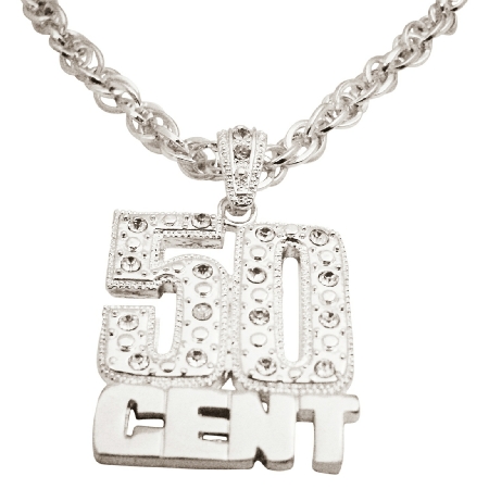 This is Smashing/Striking ! This new & Magnificent 50 Cents Pendant Engraved on Silver & decorated with cubic zircon stones studily prong Set it is really shimmering & Brilliant Pendant this Attracting & Stunning for You. It Come with new simulated platinum Necklace which is Elegant- Chic - Classic - Traditional. The Whole Pendant is in uniform color held in prog Set & quality craftsmanship to ensure quality & durability Chain Silver Rhodium Plated Length 28 inches Long Pendant length 3 1/2 inches Long 2 inches wideLobster Clasp