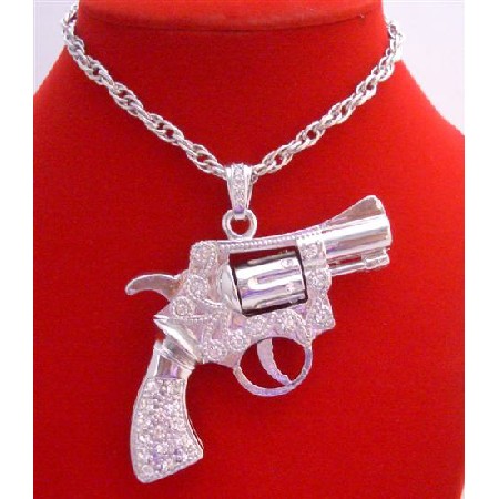 Fabulous Estate Designer Inspired Pistol Gun Pendant Silver Pendant with barrel spins & fully embedded with Cubic Zircon simulated Diamond Diamante Jewelry. Men's Passion Jewelry with stunning gun Pendant. The silver chain is of good quality which is Elegant- Chic-Classic - Traditional. Chain Length measures 30 inches Pendant 2 inches long & 3 inches wide with Lobster clasp