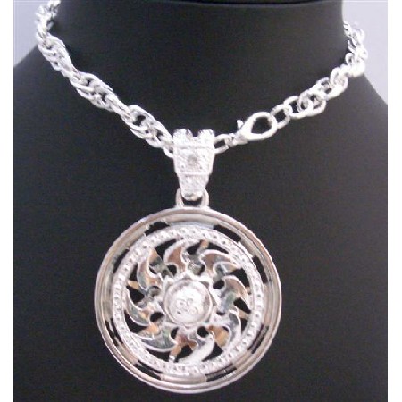 This is Smashing/Striking ! This new & Magnificent Spinning Sun Pendant Engraved on Silver & decorated with cubic zircon stones studily prong Set it is really shimmering & Brilliant Pendant this Attracting & Stunning for You. It Come with new simulated platinum Necklace which is Elegant- Chic - Classic - Traditional. The Whole Pendant is in uniform color held in prog Set & quality craftsmanship to ensure quality & durability Chain Silver Rhodium Plated Length 28 inches Long Pendant length 3 1/2 inches diameterLobster Clasp