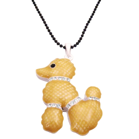 Fabulous Estate Designer Inspired Light tan Cute Poodle with Diamante decorated on the Neck Legs Tail beautifully dressed with Black Beaded long Necklace metal painted with black eyes silver chain Absolutely smashing Elegant - Chic-Classic - Traditional. Chain Length measures 28 inchesPendant length 2 1/5 inches long & wide 1 1/2 inches wideLobster Clasp