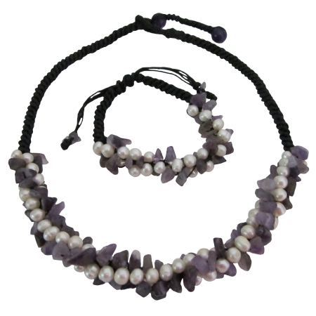 Material Used : Freshwater Pearls with Amethyst Nugget Chips Interwoven in Cotton wax Chord