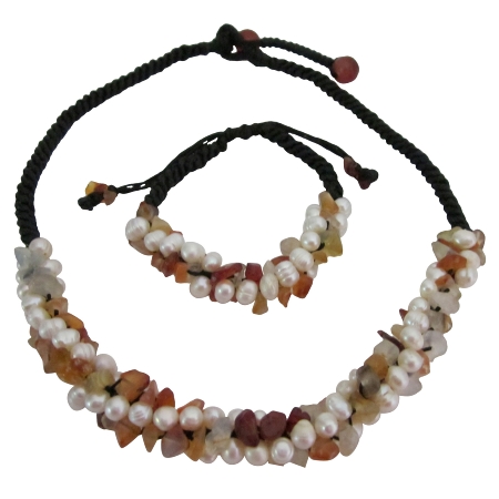 Find new design of necklace & bracelet in our classic & stylish collection These beautiful handmade freshwater pearls with carnelian nugget chips interwoven in cotton wax Chord necklace & bracelet are perfect accessory for your beach wedding dress this kind of jewelry usually available in many lovely colors & they are light in weight & comfortable to wear you cant go wrong with our spectacular freshwater pearl & nugget jewelry.