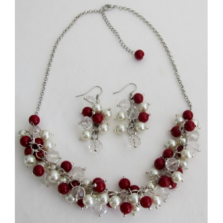 Magnificent Necklace Earrings Christmas Holiday Gift Beaded Chunky Necklace in Red Ivory pearls with clear crystal glass beads with matching cute grape dangling earrings. This would be for Party Engagement Anniversary Wedding Gift or other special occasion or would be great Holiday gift beautiful graceful eye catching.