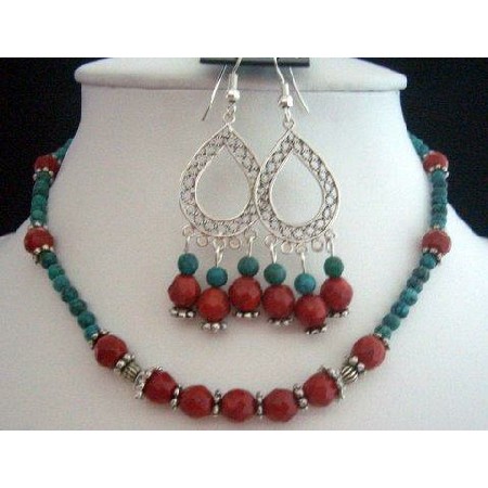 .Bountiful.lush.full-bodied theatrical adornment is teeming with Necklace & Earrings in rich complimentary colors that work magic as they delight the senses! A party on your Neck & ear lobes. festive & colorful 4mm faceted coral & brilliant 3mm green turquoise beads with bali silver oxidized with coral & green turquoise bead. This necklace set is ABSOLUTELY GORGEOUS!! & High Quality Necklace & Earring Set. The necklace length is 16 inches & extended to 18/19 inches. The Chandelier earrings is in genuine Sterling Silver with drop green turquoise & red coral bead with bali silver oxidized at bottom measures 2 to 2 1/2 inches long