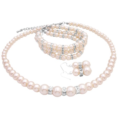 .Bountiful.lush.full-bodied theatrical adornment is teeming with Necklace Sterling Silver Earrings 3 Stranded Clasp Bracelets in rich complimentary colors Simulated Ivory Pearls with Silver Rondells Spacing sparkle like real diamond that work magic as they delight the senses! A party on your Neck ear lobes & wrist. festive & Ivory Color Pearls accented in beautiful necklace absolutely unique.