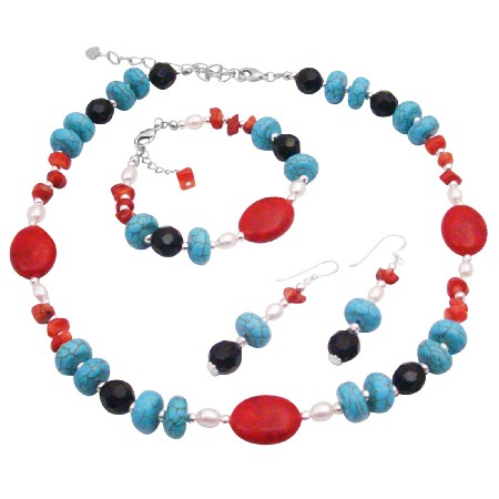 Mix of All Pearl & Semi Precious Stone Beads.Bountiful.lush.full-bodied theatrical adornment is teeming with Necklace & Earrings in rich complimentary colors that work magic as they delight the senses! A party on your Neck & ear lobes. festive & colorful Turquoise Corals Flat Bamboo Corals Onyx Silver Beads & Pearl beautifull accented in necklace. This necklace set is ABSOLUTELY GORGEOUS!! & High Quality Necklace Earring Bracelet Set. The necklace length is 17 inches & extended to 18 inches Bracelet 6 inches long with extension up to 7 inches & Earrings 2 inches long. It is array of semi precious beads not to miss add to your cart