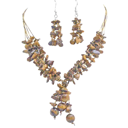 A declaration of grace dyed shells woven in silk thread with glass beads Tiger Eyes Stone Nuggetts & Tiger Eyes stone delicate sensuality! This is elegant sleek jewelry is for revitalizing your soul. Its all about feeling energized confident & sexy evening or casual wear. This is matching Silk Thread interwoven with small Tiger Eyes Chips. this fashion jewellery is a must have for fashion savvy.
