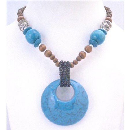 Material Used : Wooden Beads with different shaped & sizes of Blue Turquoise bali silver holding round Blue Turquoise pendant