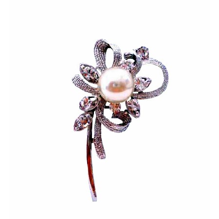 This contemporary pin is made of single cultured Pearls & Cubic Zircon dressed all over. The pin is of a nice quality. The design of the pin is single stud Pearls attached to the single silver stems. Perfect for all other occasion gifts. Measuring 2 inches but all the brilliance of a much larger pin! It is in excellent condition Attaches securely with a pin clasp