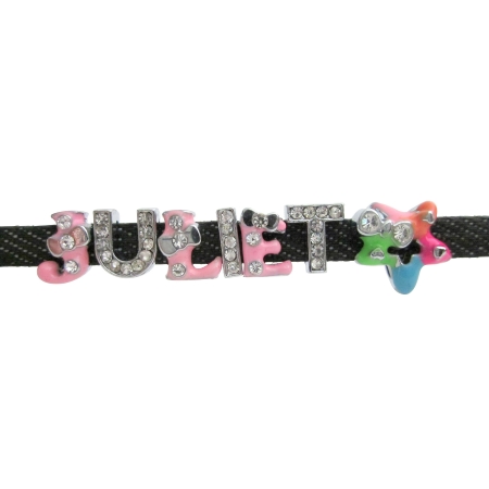 Juliet name embedded with cubic zircon on black watch strap bracelet with charm star A simple girl can get a celebrity look by sporting latest in trend fashionable jewelry styles If you want something different you can find name or any fancy word on watch strap bracelets with unique designs this makes great birthday gifts This exclusive collection of name watch strap bracelets great for daughters friends birthday return gift like 15 girls & each girl has their own name bracelet We can also customize or make any word that you want on your wrist with Unbeaten price