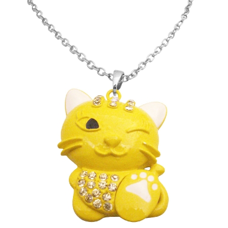 Fabulous Estate Designer Inspired yellow Cute Cat Embedded with diamate Crystals Encrusted on head & body this is Enamel metal painted cat with one eye close & showing her kick very mischievous Naughty stunning cat Pendant Necklace with silver chain Absolutely smashing Elegant - Chic-Classic - Traditional.