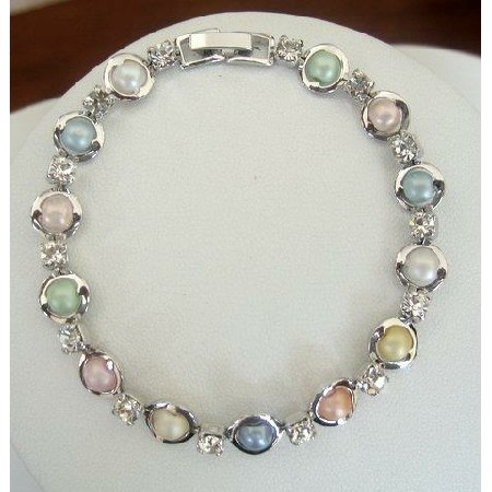 A Gorgeous high quality fine Rodium Plated with simulated multi colored Mother Pearls & Cubic Zircon all over the bracelet. It is very unique designs that make your wrist look elegant 14 Cubic Zircon stones across its length. A excellent example of first rate craftsmanship.Length 7 inches & Width 5mmLobster Clasp