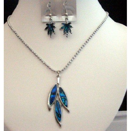 Trendy & Gorgeous Necklace Set in Dyed Dark Blue Mother Shell Leave Pendant Rhodium Plated Chain with Pendant in Dark Dyed Blue Mother Shell & earrings. Necklace Measures 17 inches long with lobster claw clasp & adjustable. Pendant measures 1 to 1 1/2 inches & earrings measures 3/4 inches. Beautifully crafted & self design in Blue Mother Shell. This sparkly Necklace Set We guarantee for the quality even if our products are reasonable as you are dealing direct with factory.This Necklace Set would make a lovely gift or great addition for your own jewelry wardrobe!