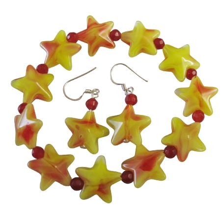 Reminding everyone of the love & joy of the Christmas season Beautiful Yellow Glass Beads in Star shaped with round red beads accented Stretchable Bracelet with Sterling Silver Earrings. Beads incorporated into a festive Christmas bracelet & earrings in contrasting colors of red & yellow. This is fun bracelet & Silver Earrings.